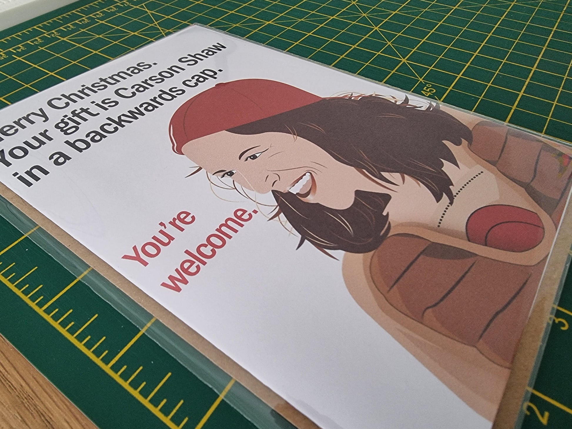 Carson Shaw Christmas card. If you have a 'A League of Their Own' fan in your life, then this Christmas card, featuring Carson Shaw (AKA Abbi Jacobson) in a backwards cap, is the perfect festive greeting card!