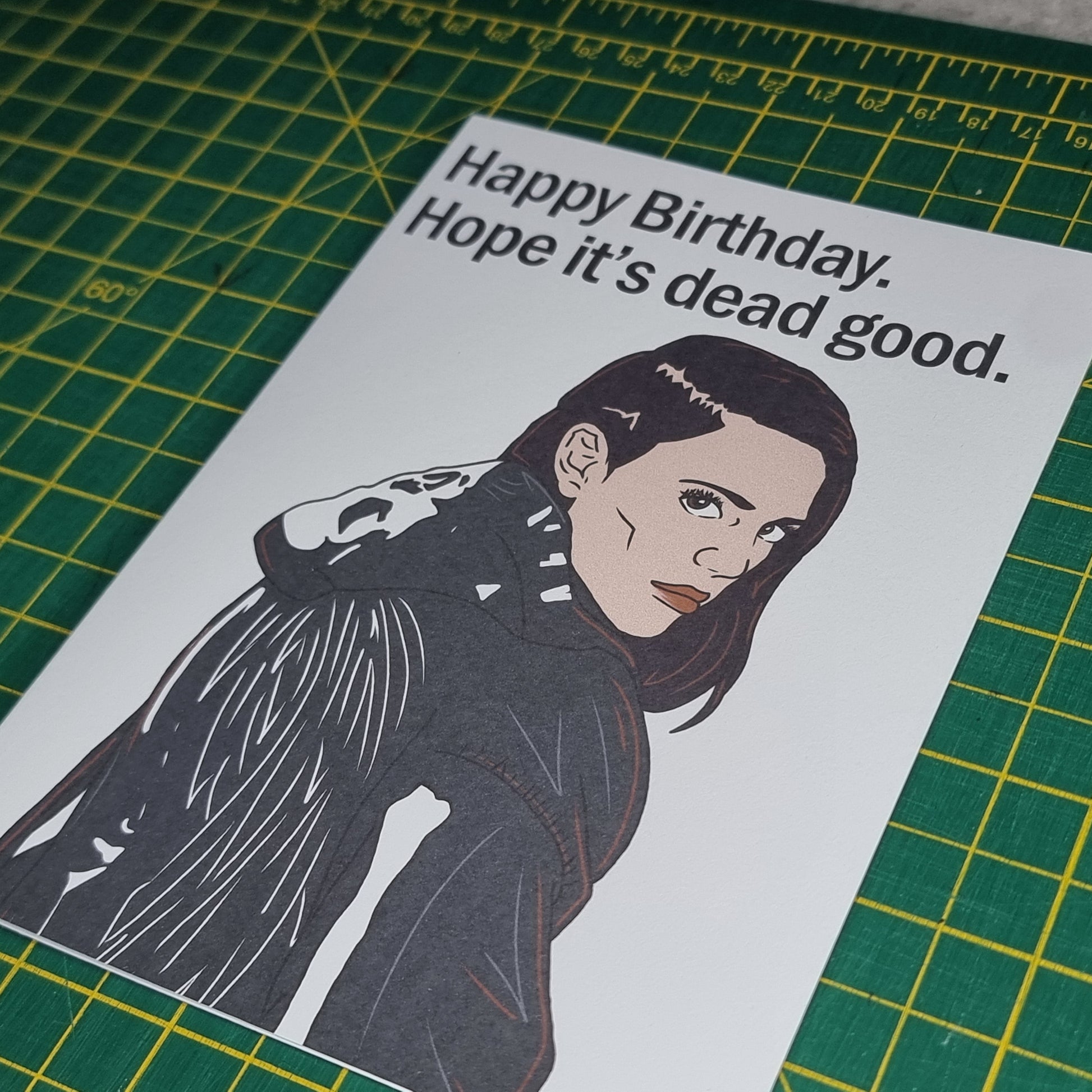 'Hope it's dead good' birthday card. Inspired by 'Revival' and featuring Em Cypress played by Romy Weltman.
