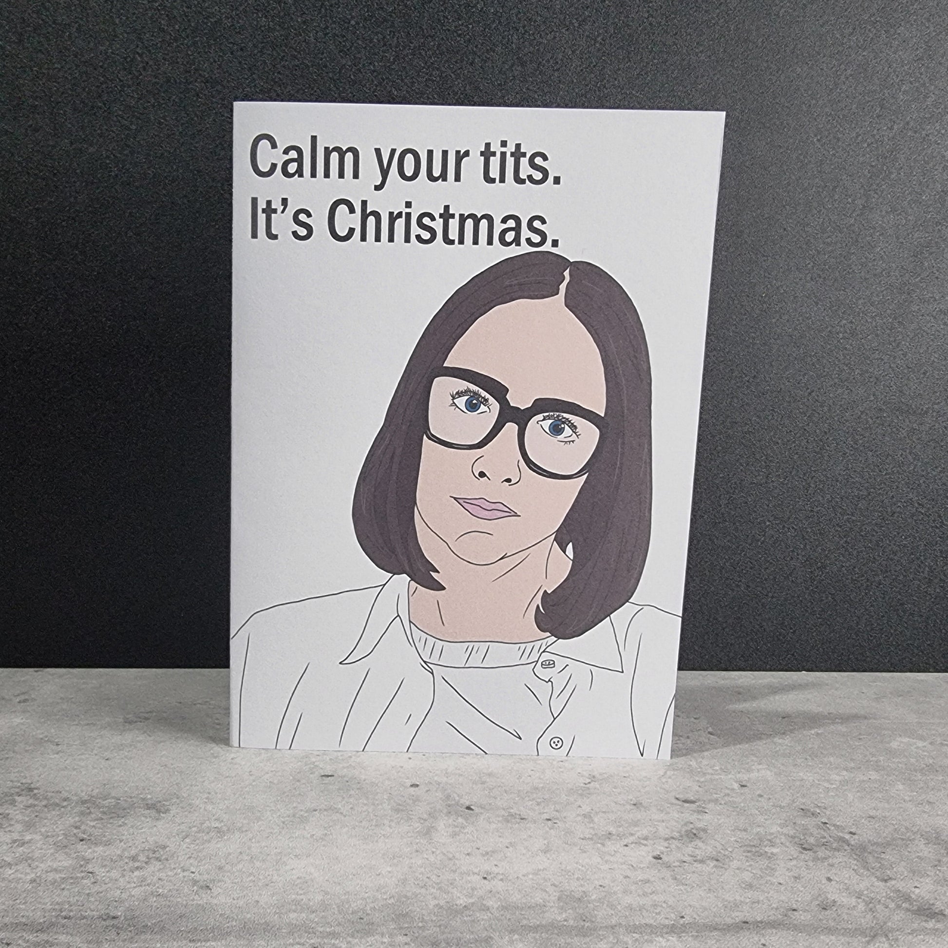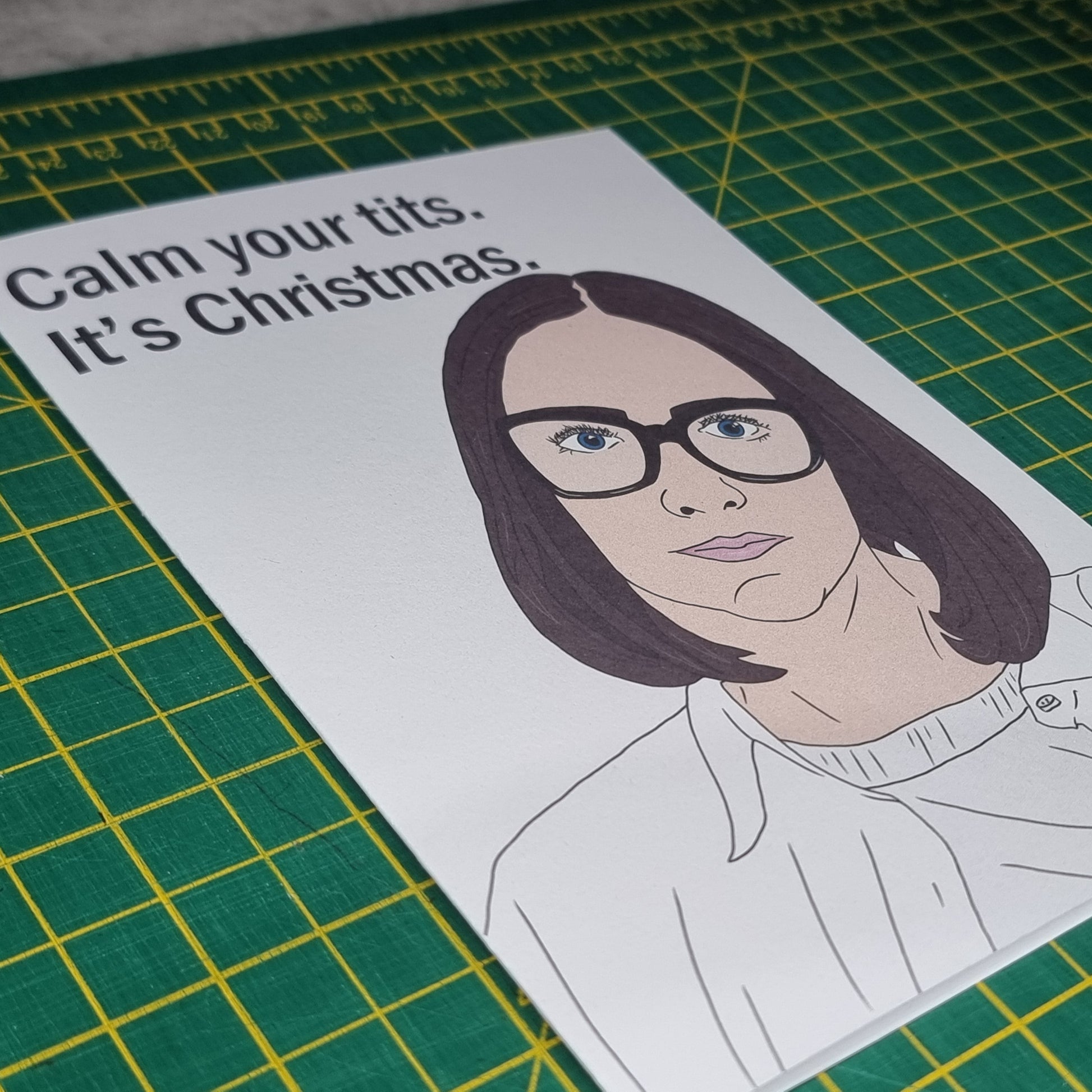 'Calm your tits' Christmas card. Inspired by 'Clickbait: Unfollowed' and featuring Shalin played by Melanie Scrofano.